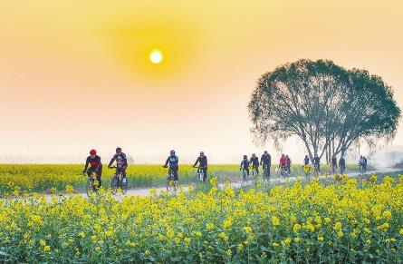 近日,在平乡县河古庙镇大张庄村,自行车运动爱好者在盛开的油菜花田边骑行。近年来,平乡县加快生态观光农业和乡村旅游融合发展,增加农民收入,助力乡村振兴。