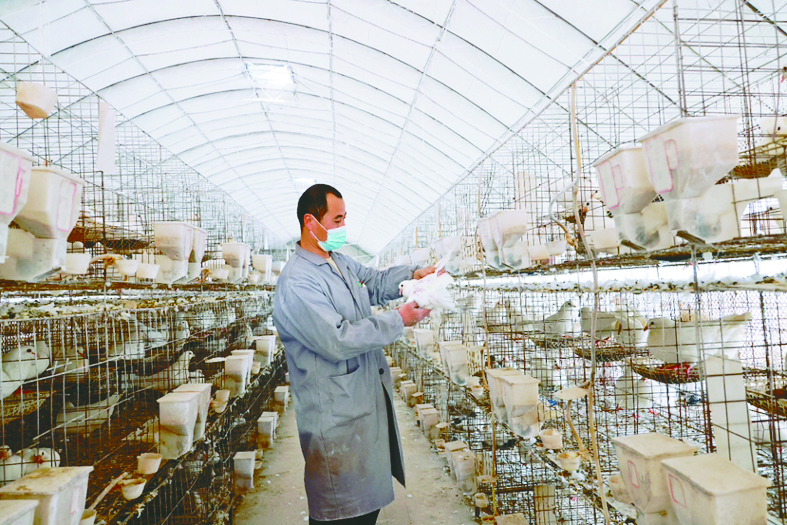 图为农民在广宗县核桃园镇柏城村鸽子养殖基地管护鸽子。
