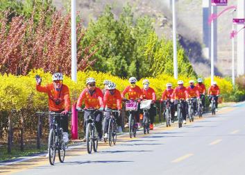 图为4月5日,信都区自行车运动协会的骑行爱好者在抗大路上骑行,乐享假日时光。